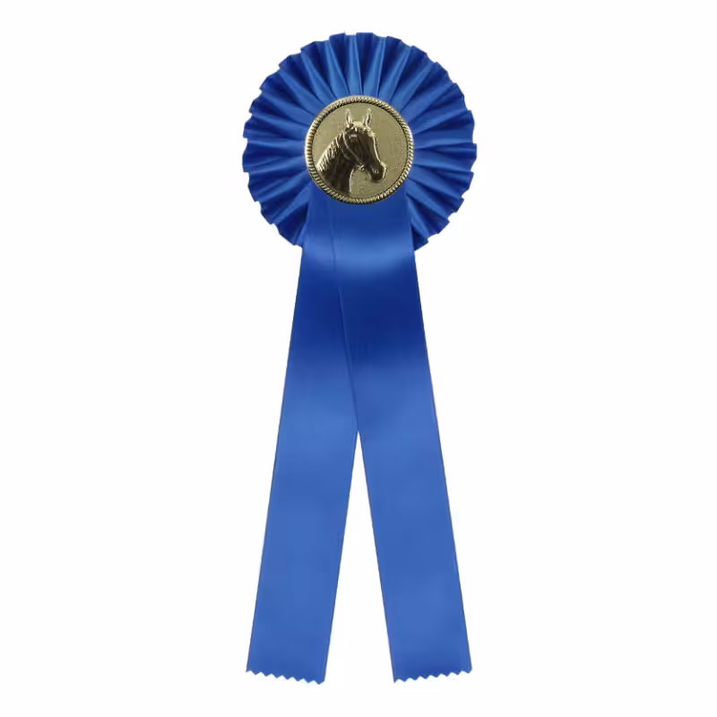 Mooie 1 Rings rozet met een doorsnede van 11,5 cm en een totale lengte van 35 cm die geleverd kan worden met een paardenhoofd of andere sport, een blanco rondje of een eigen afbeelding (logo + 50 eurocent extra kosten). Prachtig geplisseerd.