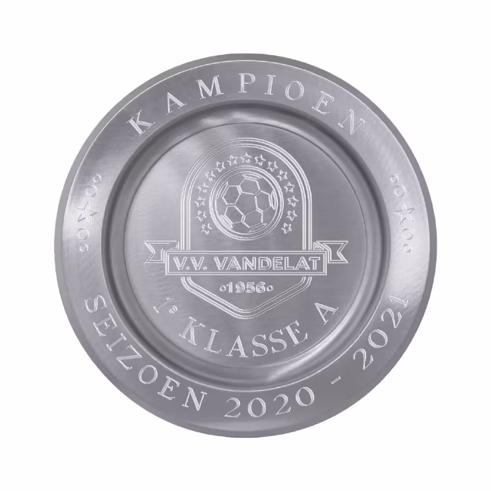 Dit metalen wandbord of kampioenschapsschaal met gladde rand heeft een diameter van maar liefst 35 cm. Je kunt het bord naar wens laten graveren, met bijvoorbeeld jouw eigen logo, afbeelding of tekst.
