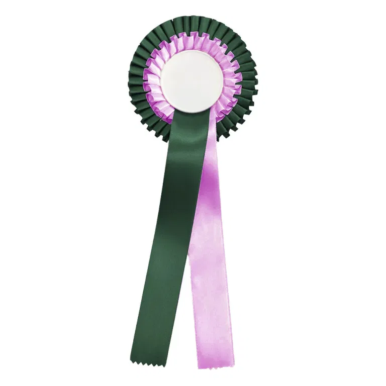Prachtige rozet bestaande uit 2 ringen waardoor er vele kleurencombinaties mogelijk zijn. Wordt net als de HS 200 rozet veel in de paardensport gebruikt, maar voldoet ook uitstekend als kampioensschapsrozet in andere sporten. De doorsnede is 12 cm, de totale lengte is 36 cm. Ook de HS 22 kan met een eigen afbeelding, een standaard paardenhoofd afbeelding of een neutraal blanco wit rondje geleverd worden.