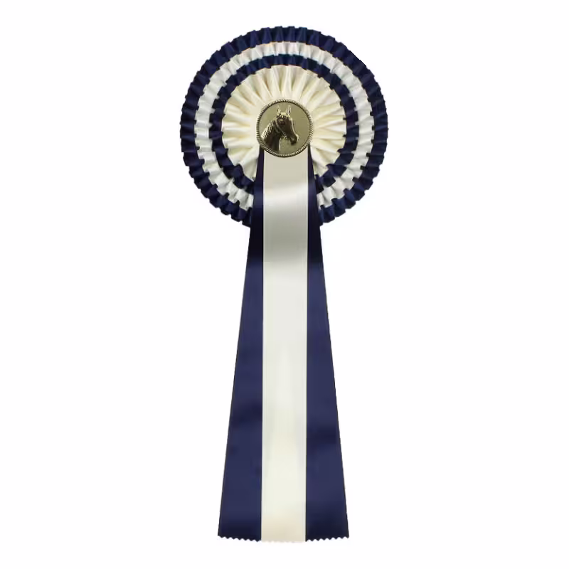 Prachtige rozet bestaande uit 4 ringen waardoor er vele kleurencombinaties mogelijk zijn. Wordt net als de HS 200 en HS 22 rozet veel in de paardensport gebruikt, maar voldoet ook uitstekend als kampioensschapsrozet in andere sporten. De doorsnede is 13,5 cm, de totale lengte is 31 cm. Ook de HS 43 kan met een eigen afbeelding, een standaard paardenhoofd afbeelding of een neutraal blanco wit rondje geleverd worden.